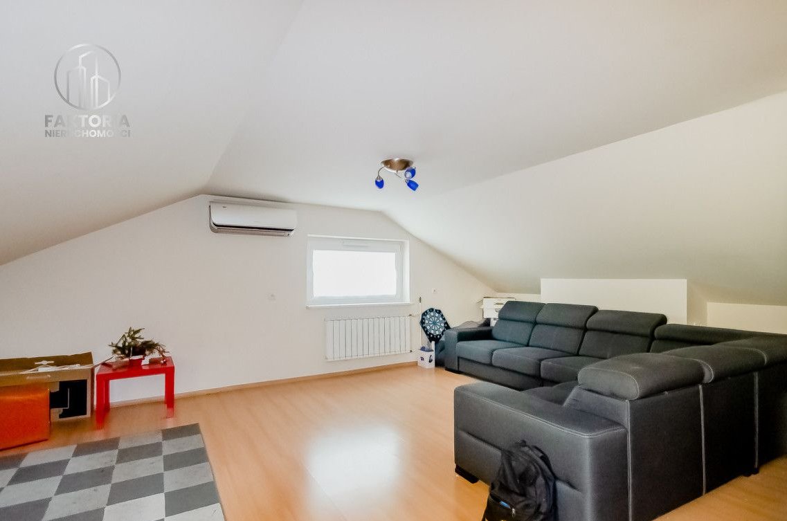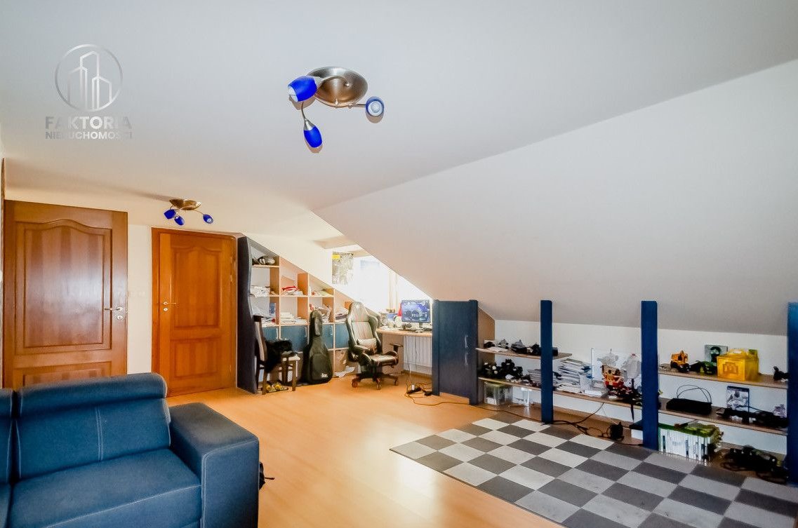 Dzięki zaadaptowaniu poddasza uzyskano dodatkową przestrzeń, na którą składa się duża, otwarta przestrzeń, która może służyć jako pokój do rekreacji. Na poddaszu znajduje się także druga garderoba oraz dodatkowa łazienka.
