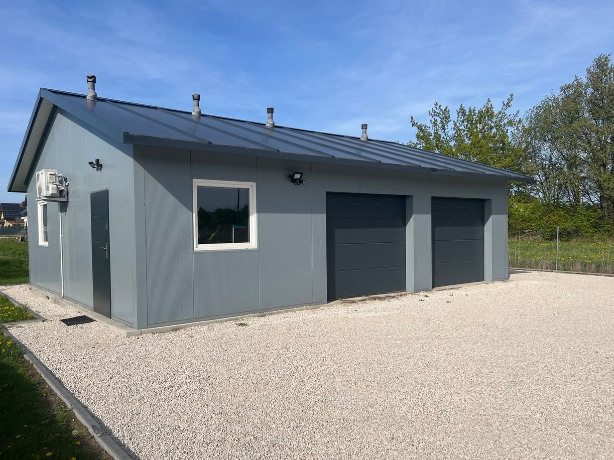 Budynek który znajduje się na terenie posesji również jest wykończony – był w nim prowadzony sklep internetowy. Składa się on z biura z wydzielonym miejscem na łazienkę ok. 25 m2 oraz magazyn o powierzchni ok. 50 m2. W biurze na podłodze jest ułożony gres, jest też zamontowany klimatyzator z możliwością ogrzewania. Budynek został wybudowany z płyty warstwowej z trzpieniem styropianowym 10 cm – ściany i dach. Jest tam też rozprowadzona instalacja elektryczna oraz system alarmowy. W razie potrzeby jest możliwość adaptacji na dodatkowy budynek mieszkalny.