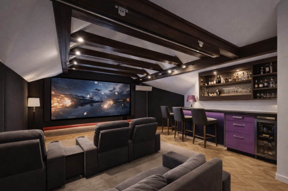 Poddasze użytkowe: Wyjątkowa strefa rozrywki z profesjonalną salą kinową (projektor, podręczny barek), dodatkowym pokojem, łazienką oraz obszernym holem.