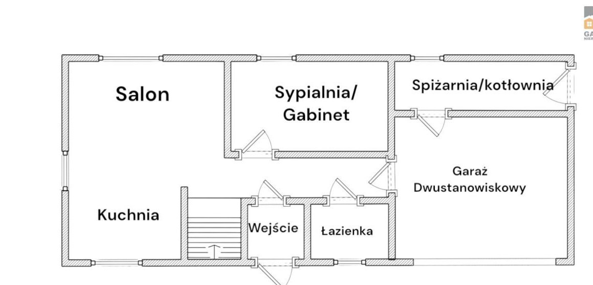 - salon, jadalnia, kuchnia, sypialnia/gabinet, łazienka, przedpokój, hol, kotłownia, pomieszczenie gospodarcze, garaż dwustanowiskowy