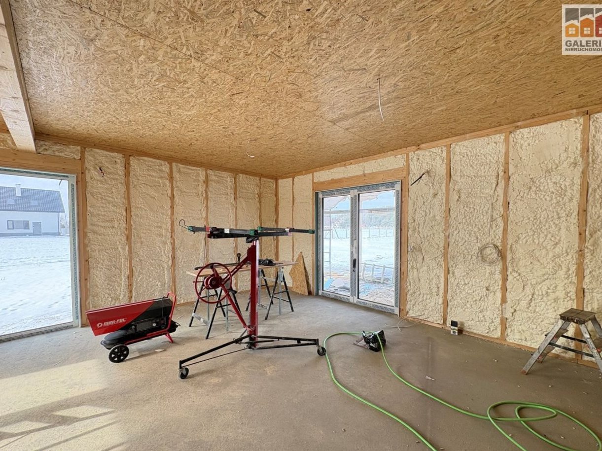 Konstrukcja ścian zewnętrznych drewniana 15 cm. Ocieplenie ścian zewnętrznych stanowi wypełnienie pianą PUR do grubości konstrukcji między słupkami, następnie płyta OSB 12 mm, na płycie, która poszywa szkielet od zewnątrz nakładana jest membrana paroizolacyjna i styropian 10 cm zakończony tynkiem elewacyjnym. Od wewnątrz konstrukcja ścian zamknięta jest płytą OSB 12 mm i płyta gipsowo-kartonowa.. Fudament ocieplono styropianem 20 cm. Zastosowano ogrzewanie podłogowe zarówno na parterze, jak i na poddaszu, co zapewnia wysoki komfort cieplny oraz niskie koszty eksploatacji. Dodatkowym atutem jest zadaszony taras, idealny do wypoczynku i spędzania czasu na świeżym powietrzu.