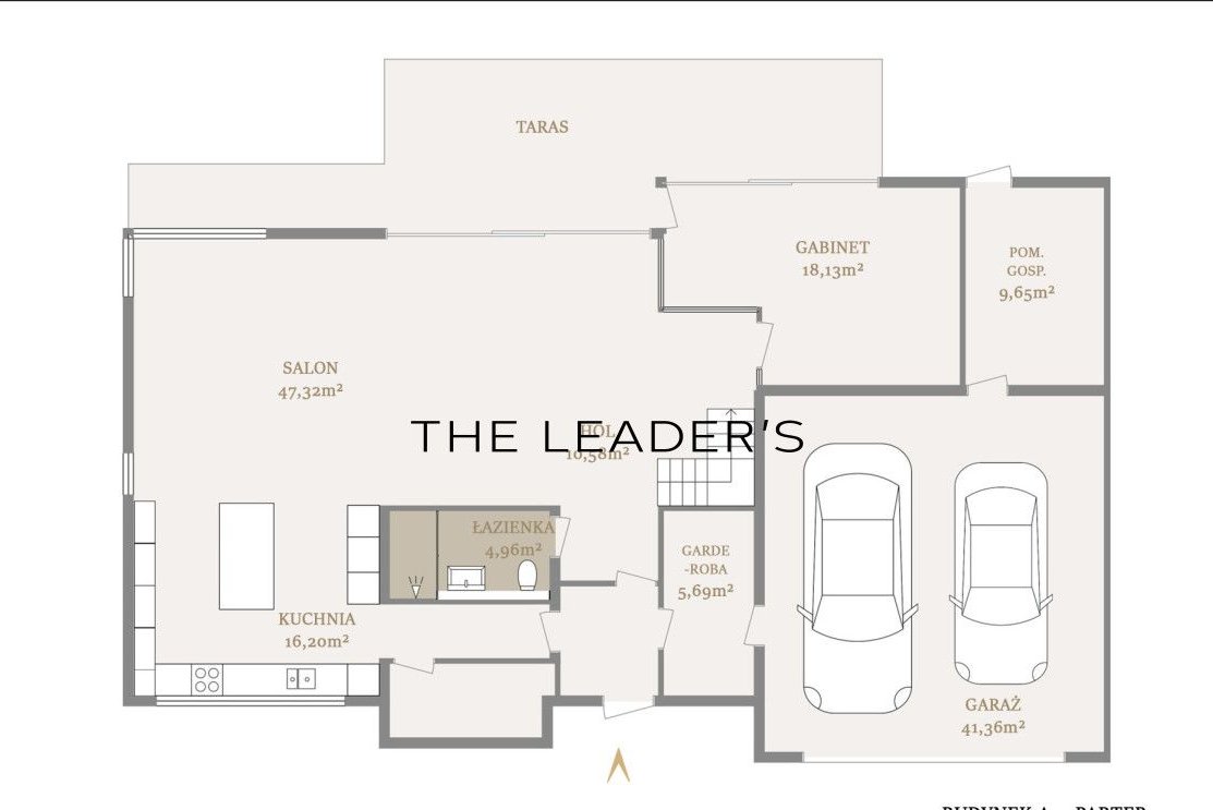 Dom posiada obszerny dwustanowiskowy garaż z dodatkowym pomieszczeniem magazynowym lub miejscem na motocykl.