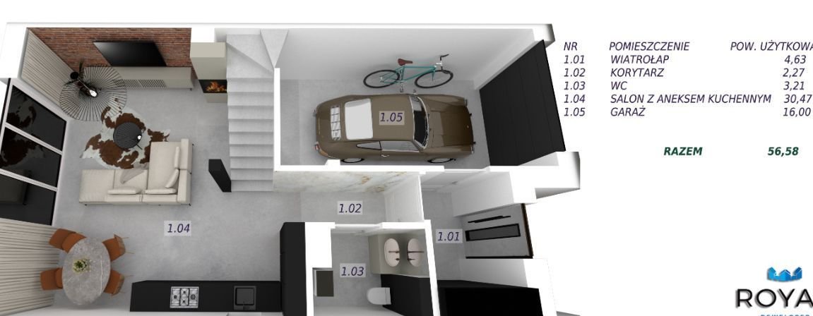 Salon połączony z kuchnią o powierzchni 30m2, cztery sypialnie, dwie łazienki.