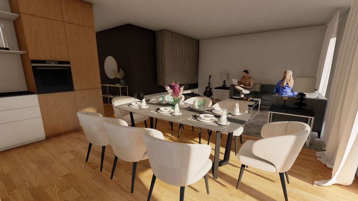 Przestronny salon z otwartą kuchnią – idealne miejsce do spędzania wspólnego czasu z rodziną i przyjaciółmi. Otwartość kuchni na salon sprawia, że przestrzeń staje się jeszcze bardziej funkcjonalna i łatwa do zagospodarowania.