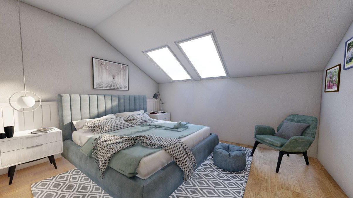 Przestronne poddasze – dodatkowa przestrzeń, którą można zaadoptować na dodatkowe pokoje, biuro, pracownię lub przestrzeń rekreacyjną.