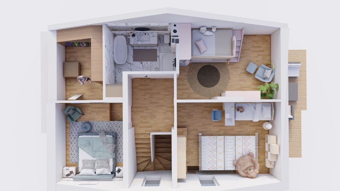 Trzy sypialnie, które oferują komfortową przestrzeń do odpoczynku i zapewniają prywatność każdemu z domowników z czego jedna z nich będzie wyposażona w antresolę, co dodatkowo zwiększy jej funkcjonalność i atrakcyjność.