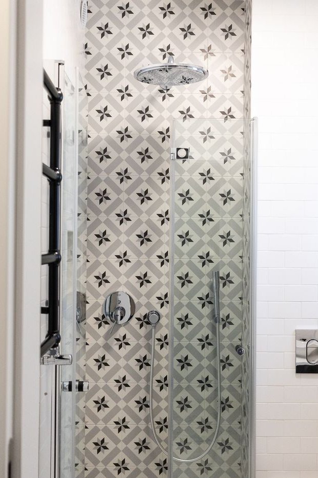 Toaleta gościnna z prysznicem, toaletą i umywalką