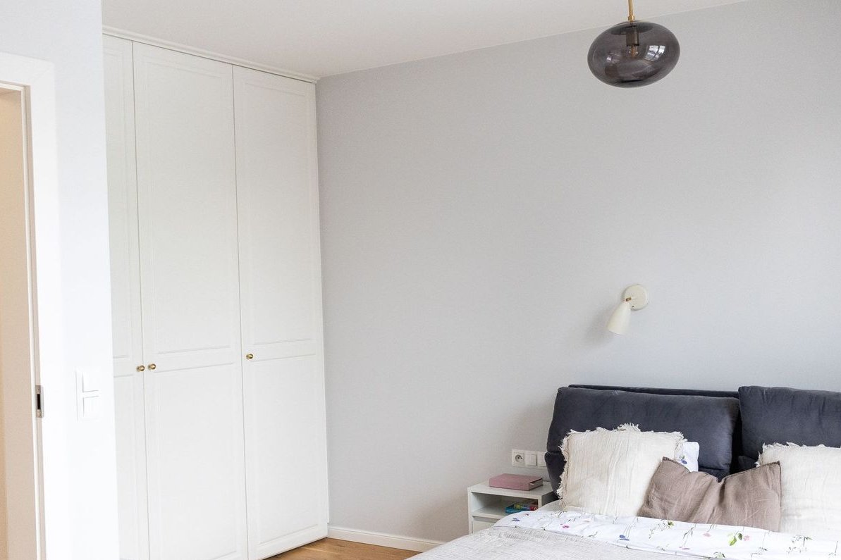 Sypialnia główna z zabudowaną szafą na wymiar. Sypialnia powstała z połączenia dwóch pokoi (możliwość powrotu do koncepcji pierwotnej i wydzielenia dodatkowego pokoju)