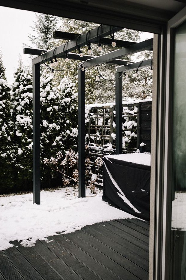 Wyjście na taras z pergolą i do ogrodu. Taras wykonany z naturalnego drewna- modrzew syberyjski