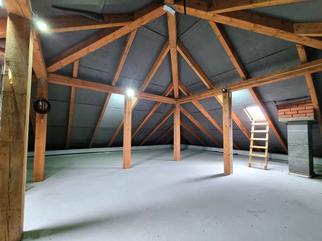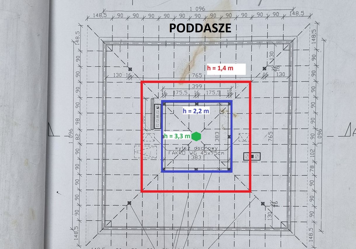 PODDASZE z funkcja użytkową obejmuje powierzchnię ok. 107 m2 po podłodze, z pełną wysokością użytkową w strefie środkowej (wys. od 3,3 m do 2,2 m a następnie do 1,4 m) zmniejszającą się płynnie do skosów na obrzeżach poddasza. Poddasze jest doświetlone światłem dziennym przez okna połaciowe oraz za pomocą oświetlenia elektrycznego. Z uwagi na docieplenie stropu poddasza nad parterem styropianem gr. 30 cm może ono stanowić odrębną przestrzeń, która nie wpływa na komfort cieplny parteru zarówno w okresie grzewczym jak i w lecie, chroniąc parter przed nadmiernym nagrzewaniem się.