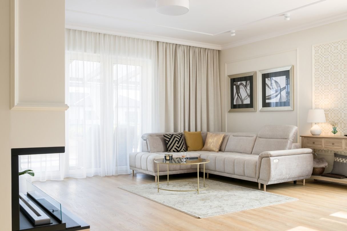 duży salon z aneksem kuchennym o powierzchni 42.69m2