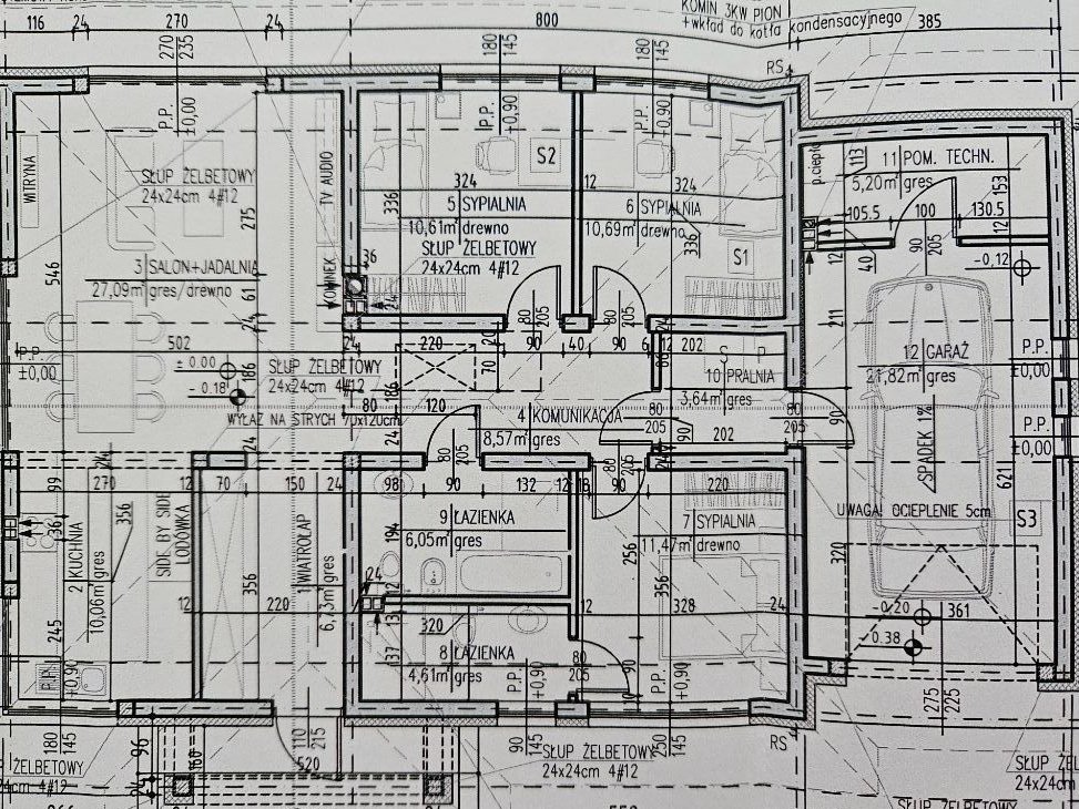 Składa się z dużego salonu, 3 sypialni, dużej kuchni z widokiem na las, przestronnego holu, wiatrołapu, 2 łazienek, kotłowni i garażu.