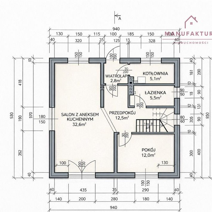 PARTER: przestronny salon z kuchnią, pokój, łazienka, kotłownia, przedpokój, pomieszczenie gospodarcze