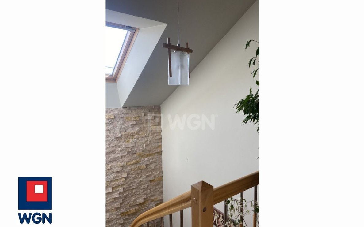 Na parterze domu znajduje się otwarty salon z kuchnią (meble drewniane z kamiennymi blatami) oddzielony barkiem pokrytym naturalnym kamieniem, pomieszczenie gospodarcze pełniące również funkcję pralni i kotłowni (stojący kocioł kondensacyjny Valliant + zbiornik na wodę 300l) z przejściem do garażu oraz nowoczesną łazienką z deszczownicą i WC.