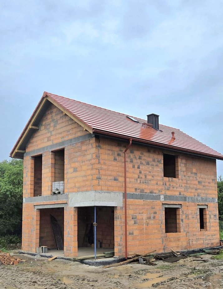 dachówka betonowa płaska w kolorze ceglastym, rynny plastikowe