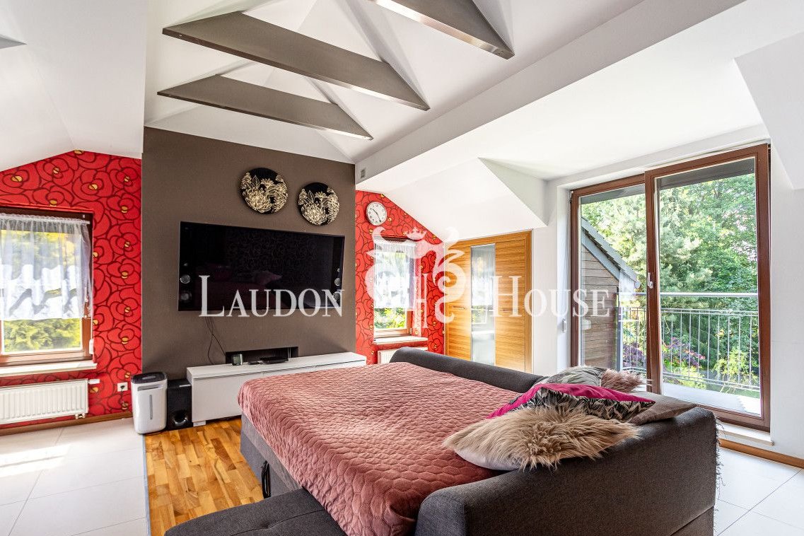Piętro to część prywatna, na którą składa się przestronna sypialna Master z prywatną łazienką oraz balkonem z pięknym widokiem na ogród. Dwie dodatkowe sypialnie, łazienka dzieci oraz przestronny pokój kinowy.