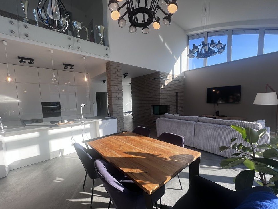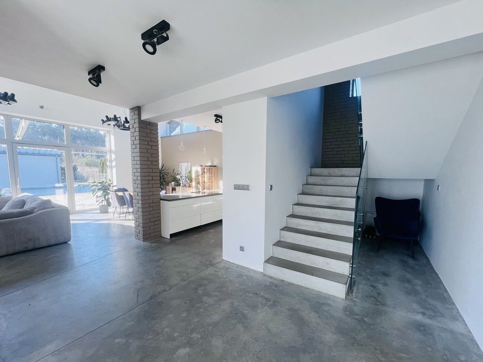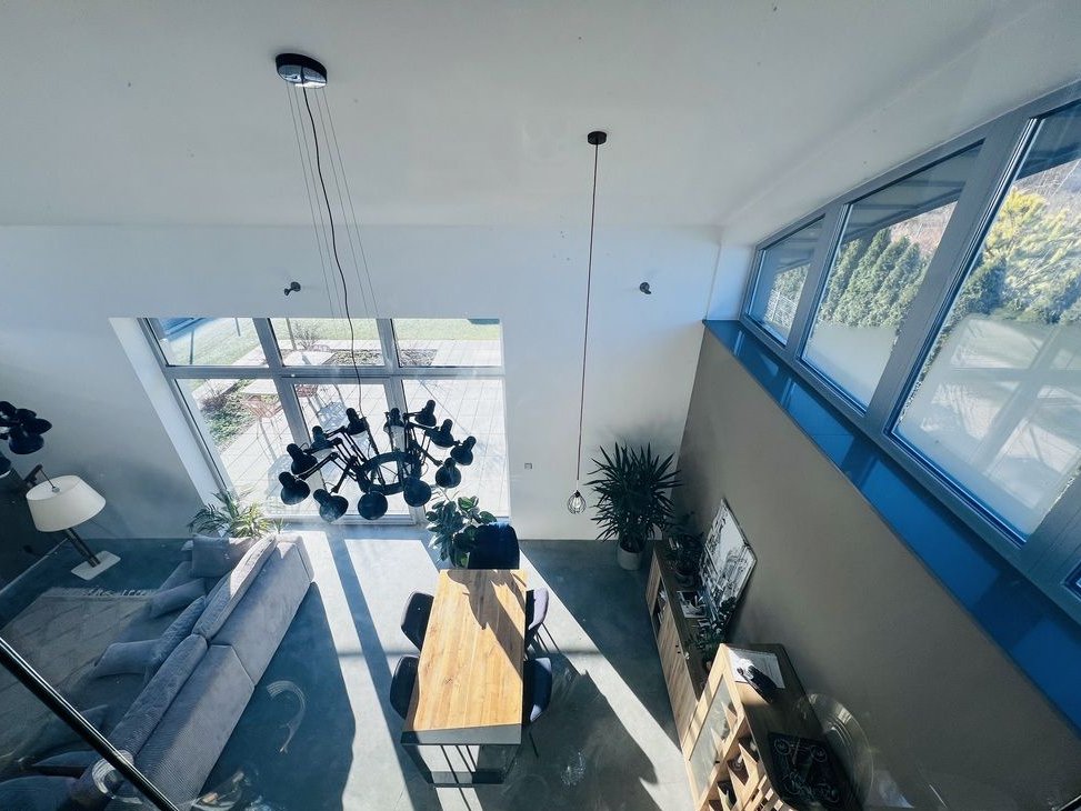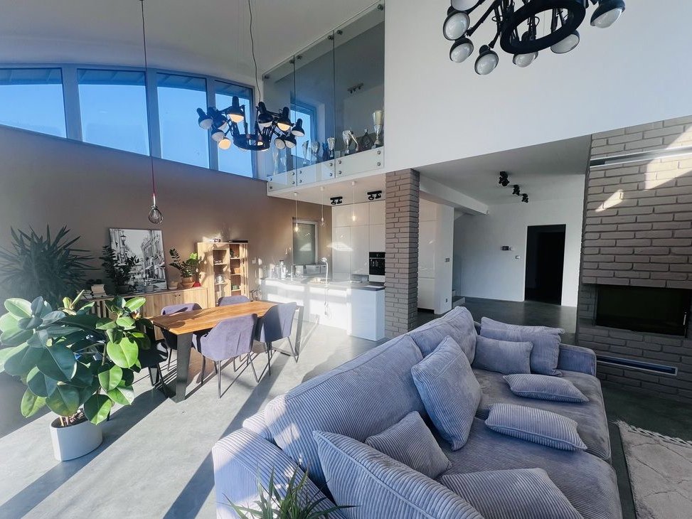 Dom został zrealizowany według autorskiej koncepcji – jego wyrazista forma, wysokie przeszklenia oraz otwarcie na ogród sprawiają, że trudno przejść obok niego obojętnie. To nowoczesna bryła z antresolą, która nadaje wnętrzu lekkości i spektakularnego efektu przestrzeni.