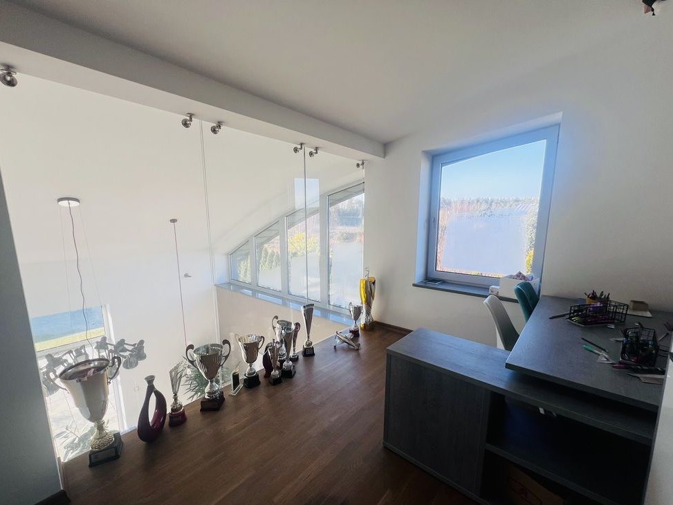 gabinet z przeszkloną ścianą i widokiem na część dzienną (antresola)