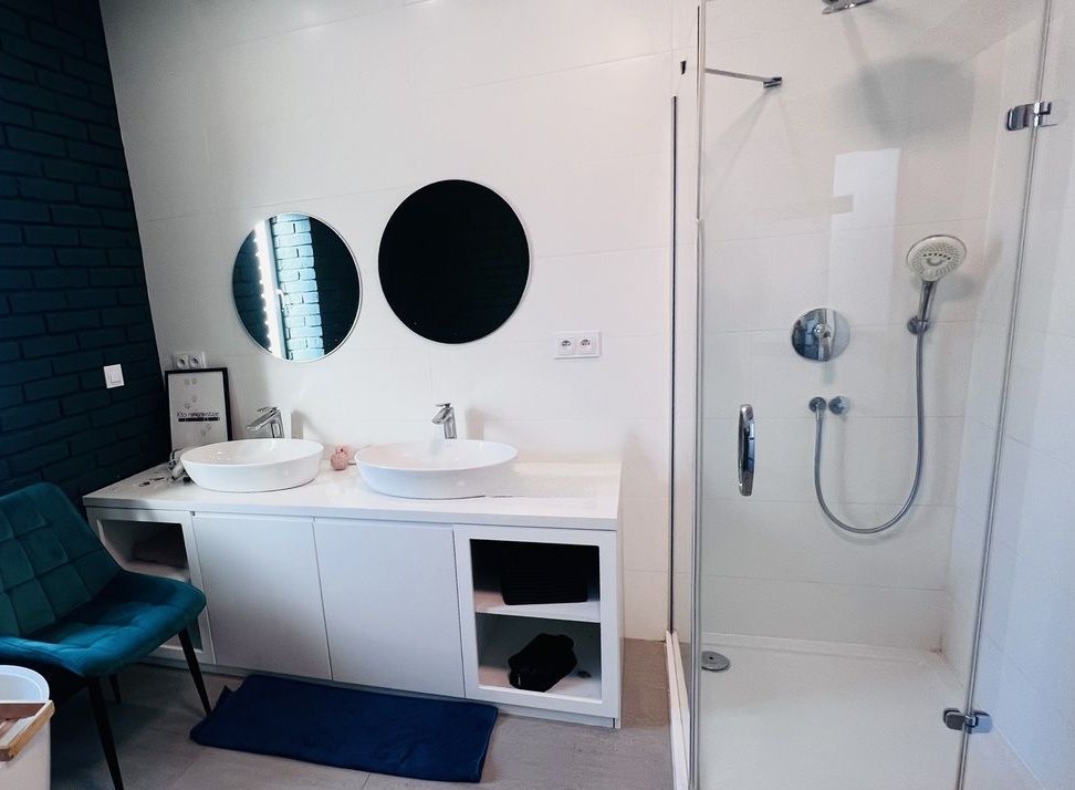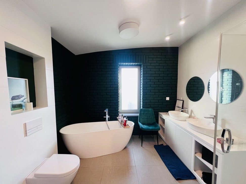 przestronną łazienkę z wolnostojącą wanną, kabiną prysznicową oraz podwójną umywalką
