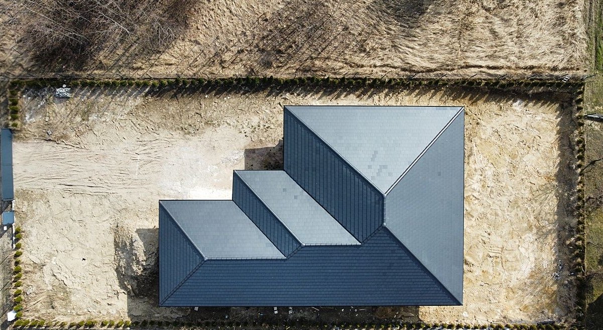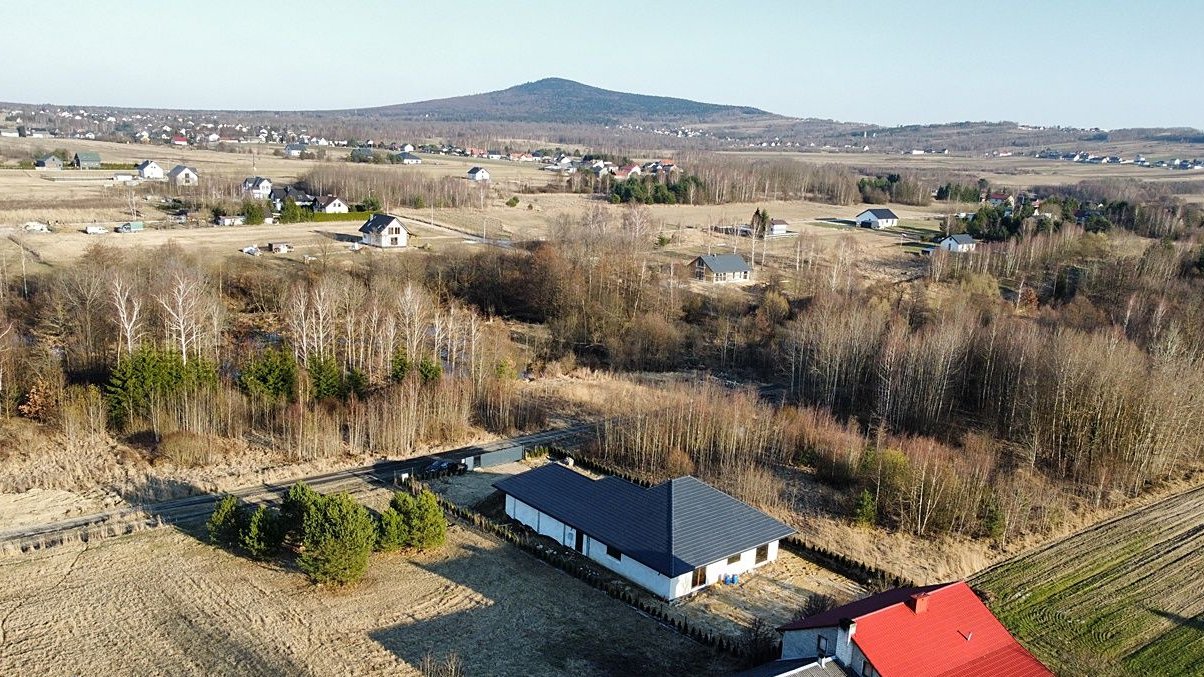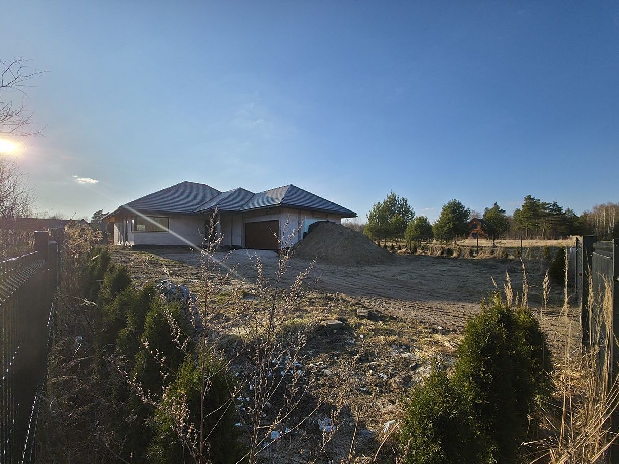 Dom parterowy, z niezagospodarowanym poddaszem. Usytuowany na działce o powierzchni 1152 m2, ogrodzonej siatką ze specjalnym nasadzeniem tuj, po całej długości ogrodzenia. Budynek w stanie surowym zamknietym, z wyprowadzonym przyłączem elektrycznym. Projekt obejmuje łącznie 4 pokoje, w tym 3 sypialnie. W jednej z nich przewidziano odrębną łazienkę z garderobą. Dodatkowo w garażu zaprojektowano wyjście do zewnętrznej piwnicy. Dach pokryty został dachówką ceramiczną BRASS. Idealny do własnych adaptacji, ze względu na etap obecnych prac. Istnieje możliwość zaadaptowania poddasza, dla drugiej rodziny.