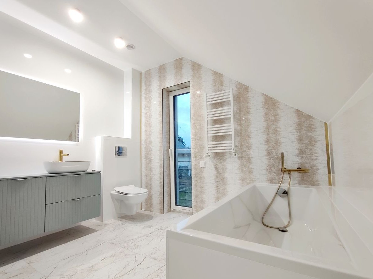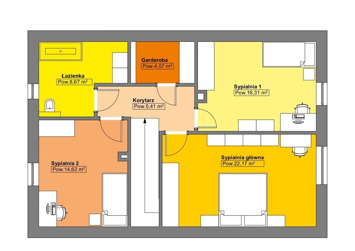 - Piętro: trzy niezależne sypialnie, duża łazienka, osobna garderoba.