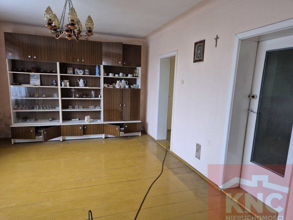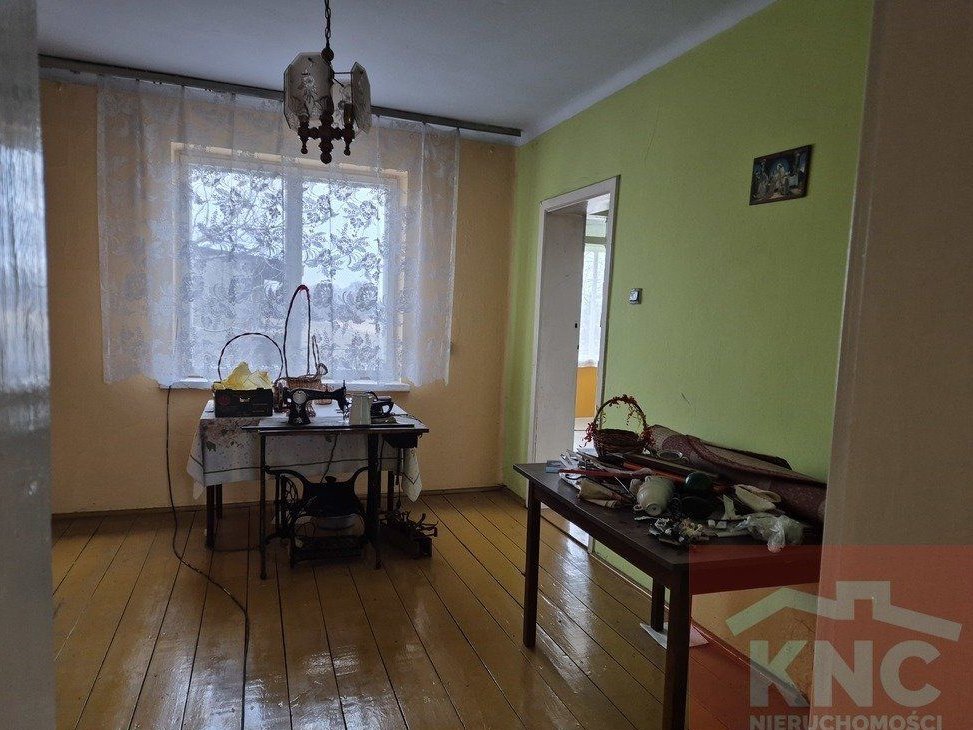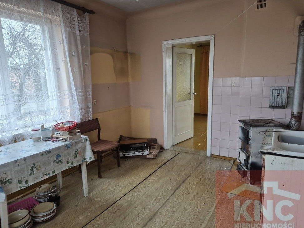 Układ pomieszczeń: parter składający się z trzech pokoi + kuchnia + łazienka. Budynek jest podpiwniczony oraz posiada strych nadający się do własnej adaptacji. Okna drewniane, dach pokryty papą, podłogi drewniane z desek, ściany tynk. Dom ogrzewany jest piecem węglowym (rozprowadzone centralne ogrzewanie). Dom mieści się na działce o powierzchni około 1900 m2 i wymiarach około 21m x 92m, nadającej się do własnej adaptacji. Na posesji znajduje się budynek gospodarczy, murowany, z możliwością przebudowy na garaż lub zaaranżowania w inny sposób.