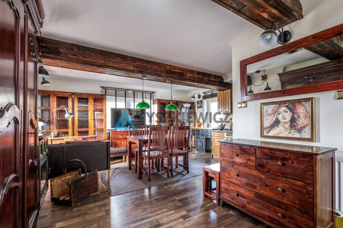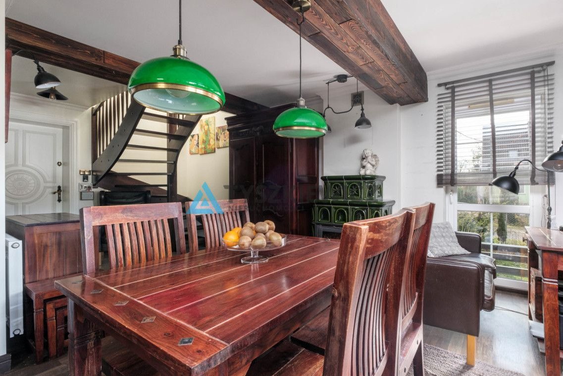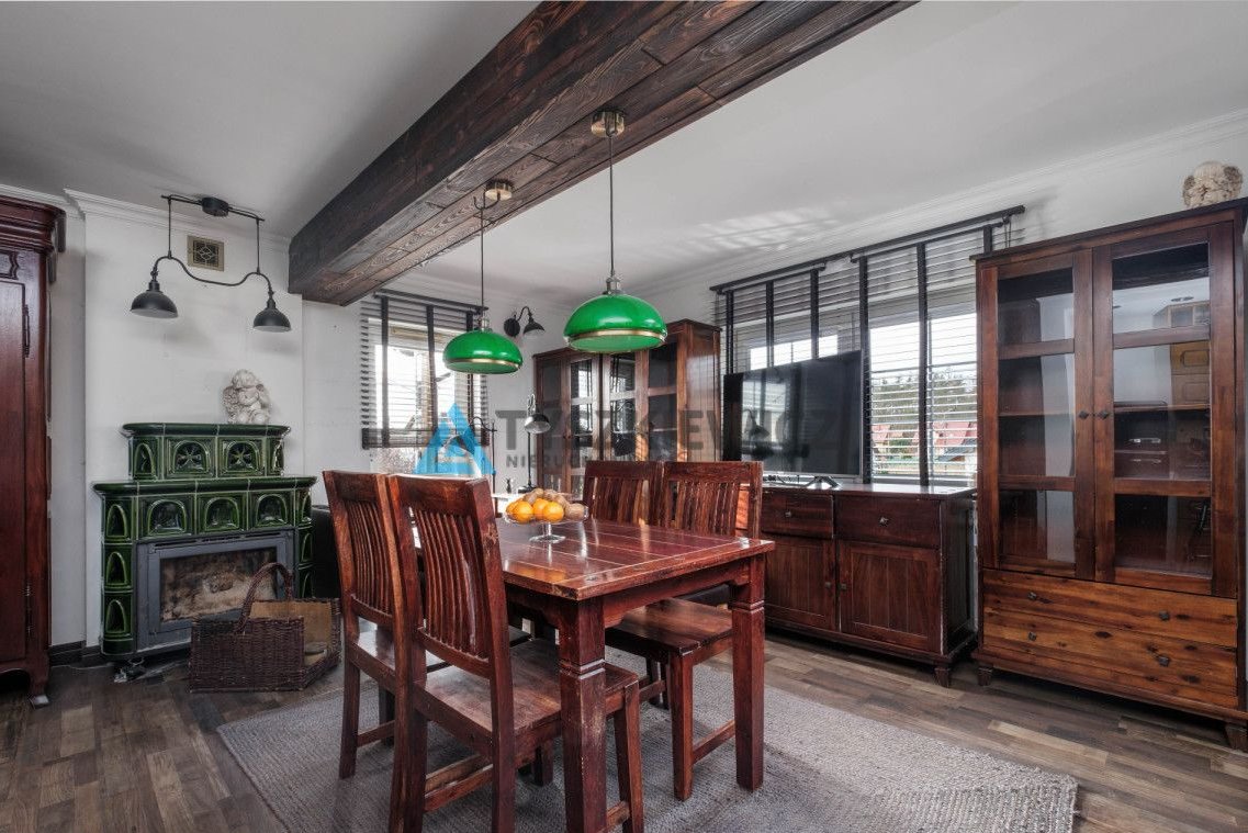 Salon z kuchnią: Serce salonu to przepiękny piec kaflowy w towarzystwie ciemnego drewna jest bardzo przyjemne do spędzania czasu wieczorami. Kuchnia wyposażona w niezbędne udogodnienia