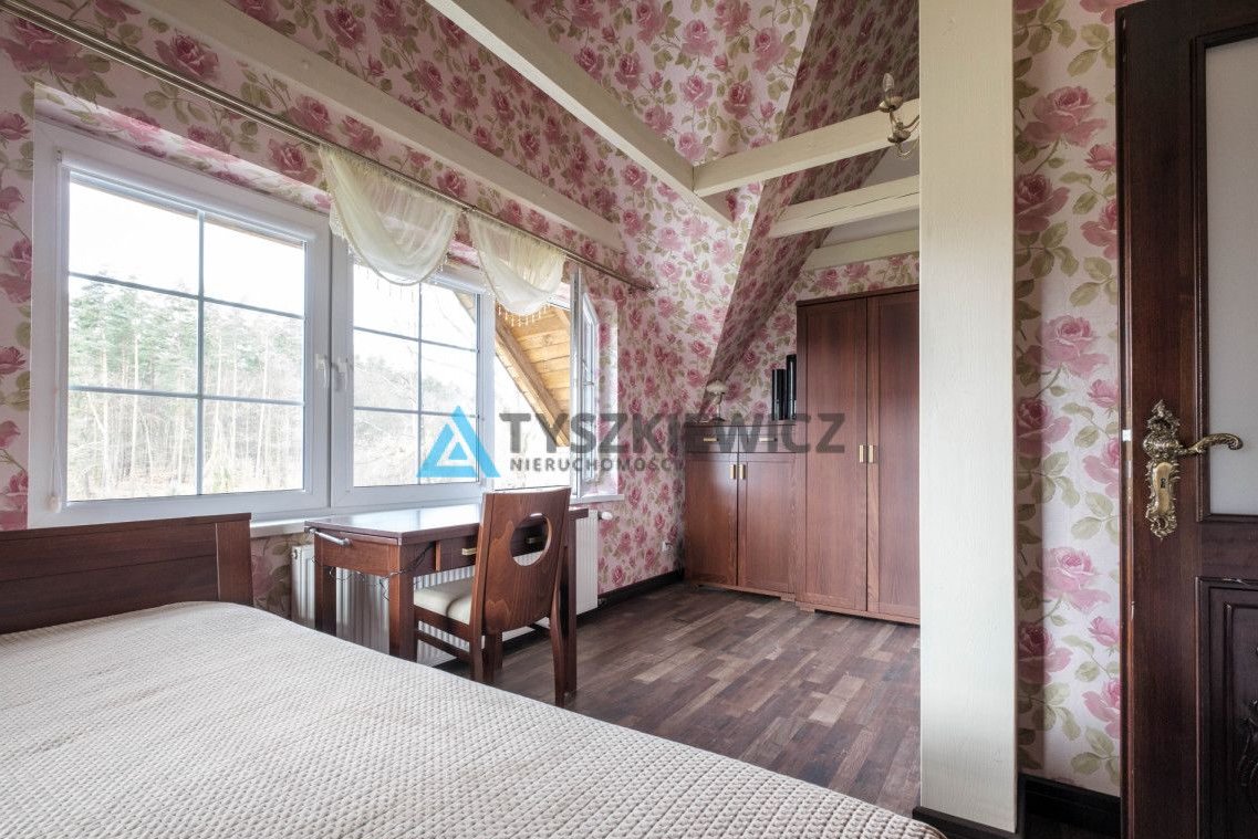 Sypialnia: bajeczny klimat z widocznymi belkami konstrukcyjnymi sprawiające, że całość daje poczucie przestrzeni, szerokie okna dają widok na ogród oraz las.