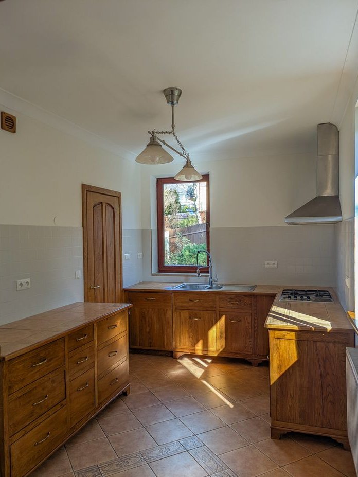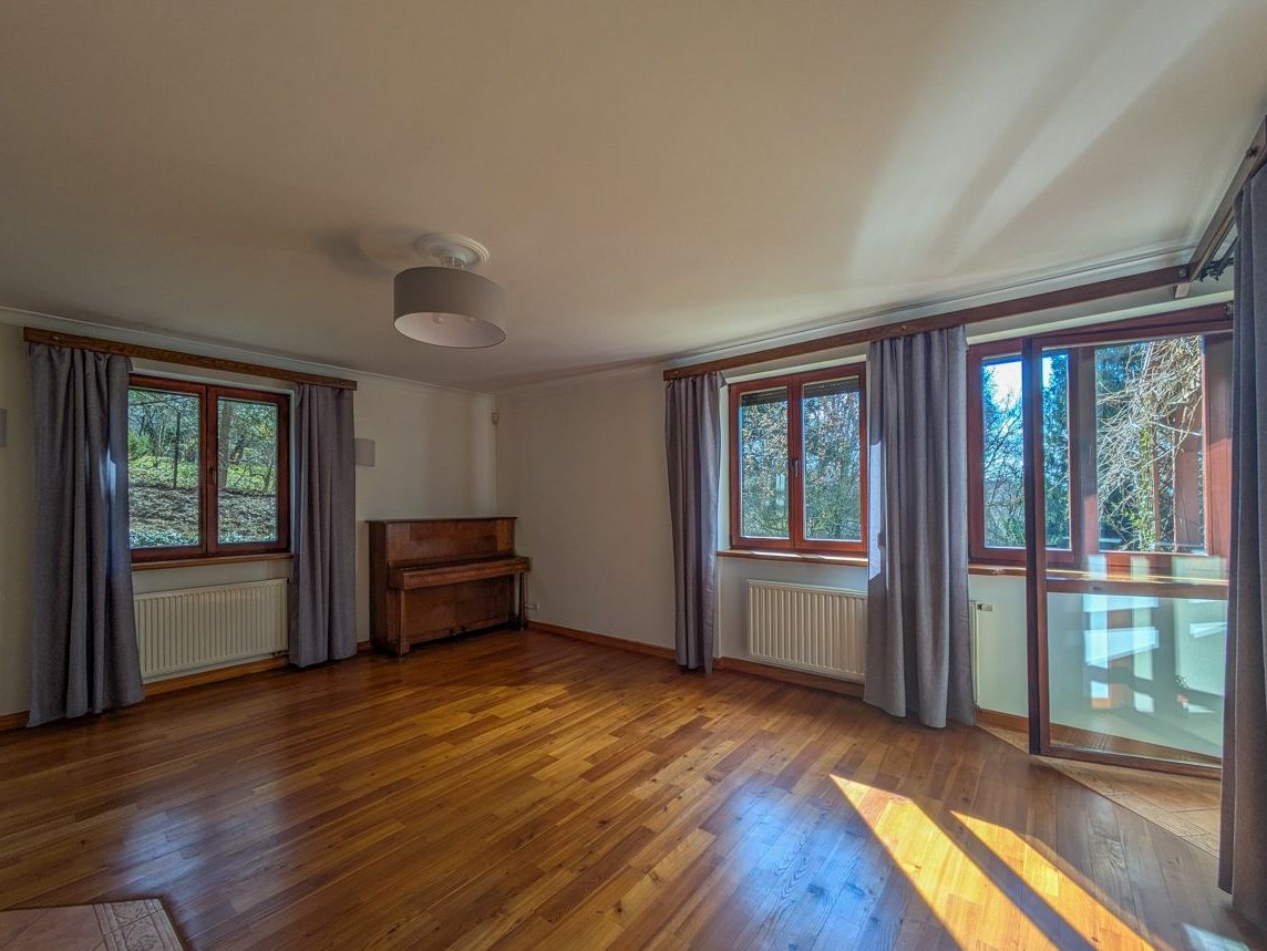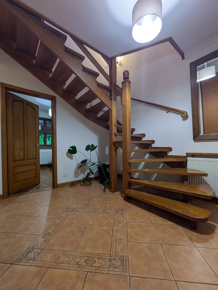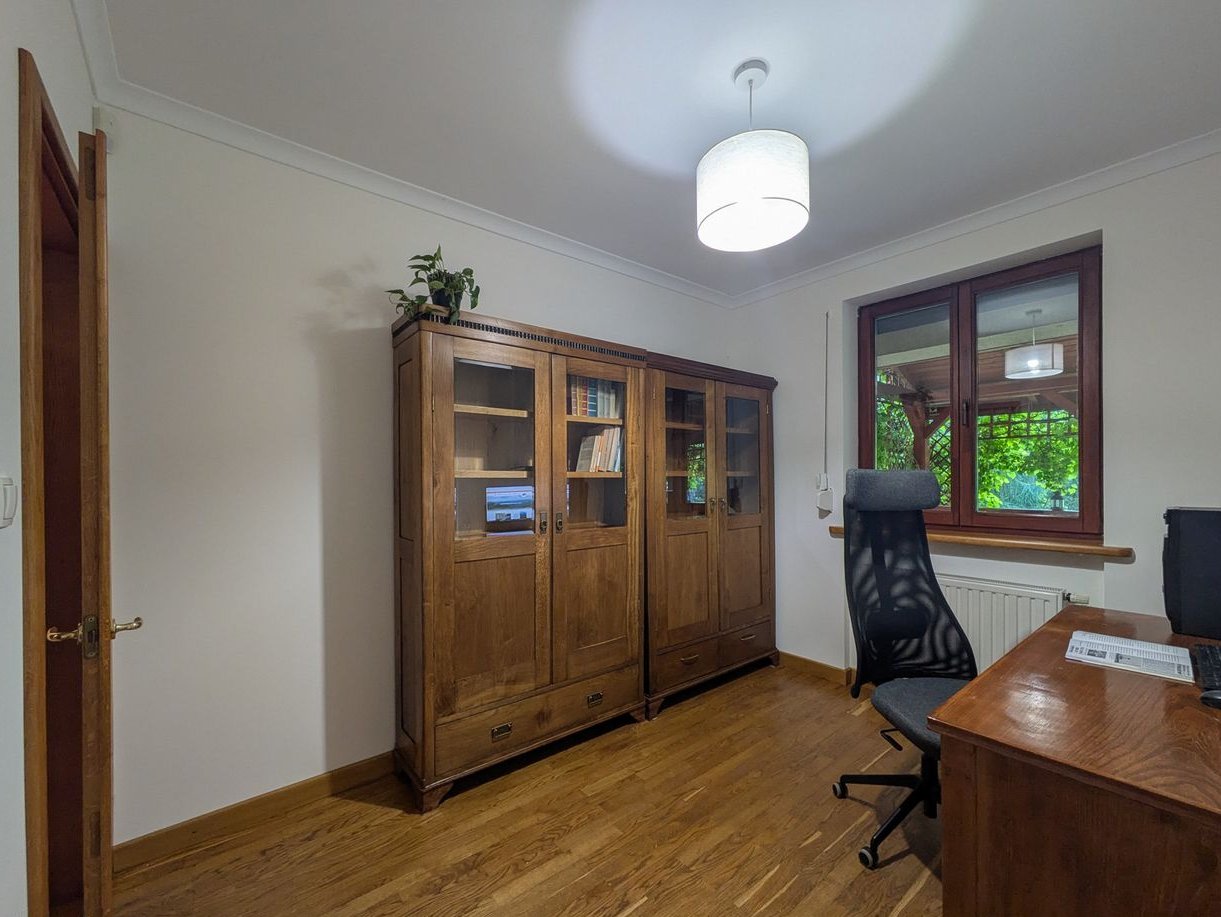 Wszystkie pomieszczenia posiadają oryginalną dębową stolarkę wykonaną na zamówienie (drzwi, parapety, itp.), w salonie zaś znajduje się modrzewiowa podłoga. Prowadzące na piętro schody wykonane są w całości z litego dębu.