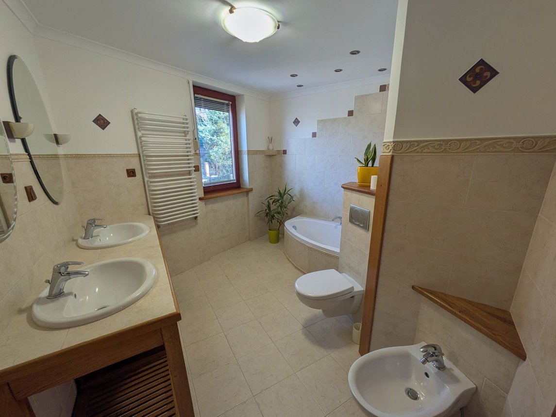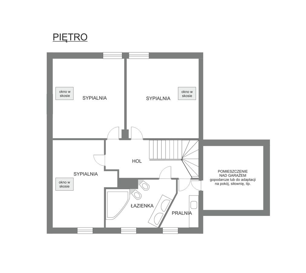 Na piętrze znajdują się 3 sypialnie (20, 21, 16 m² z niewielkimi skosami), duża łazienka (8,3 m²), obok pralnia (5,7 m² ze skosami) oraz ocieplone i ogrzewane pomieszczenie nad garażem, które może być zaadaptowane na dodatkowy pokój, siłownię, saunę lub inne w pełni funkcjonalne pomieszczenie.