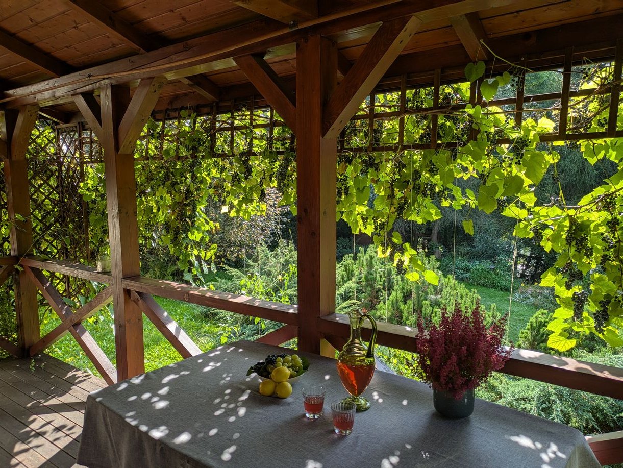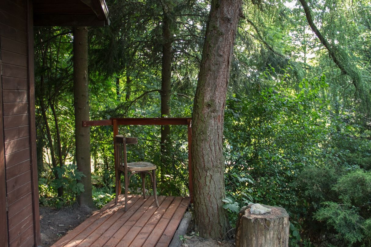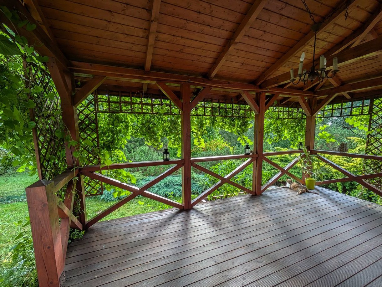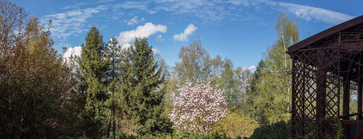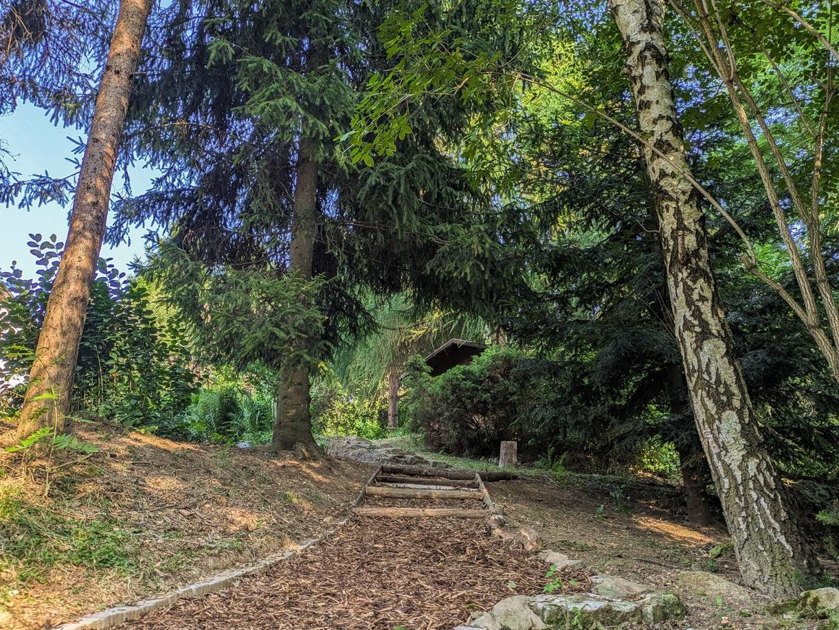 Cały teren wokół domu obsadzony jest wieloma gatunkami drzew i krzewów. Kaskadowy układ działki został wykorzystany do stworzenia kilku tematycznych tarasów połączonych kamiennymi murkami i schodkami. Na jednym z nich znajduje się trawnik otoczony krzewami (idealne miejsce do rekreacji – badminton, piłka, itp.), a poniżej ogródek z dużymi krzewami owocowymi oraz grządki wzniesione. Obok znajduje się drewniany domek (4 m²) z małym tarasem. Najniższą część ogrodu stanowi teren intensywnie zadrzewiony ze ścieżką pod okazałymi świerkami, jodłami i sosnami oraz urokliwą polanką z poziomkami, miejsce idealnie sprzyjające wyciszeniu i wypoczynkowi. Całość działki otaczają gęste krzewy i stare drzewa co gwarantuje niespotykaną w warunkach miejskich prywatność tworząc przydomowe zacisze, a dzięki kaskadowemu układowi terenu umożliwia duże jego nasłonecznienie.