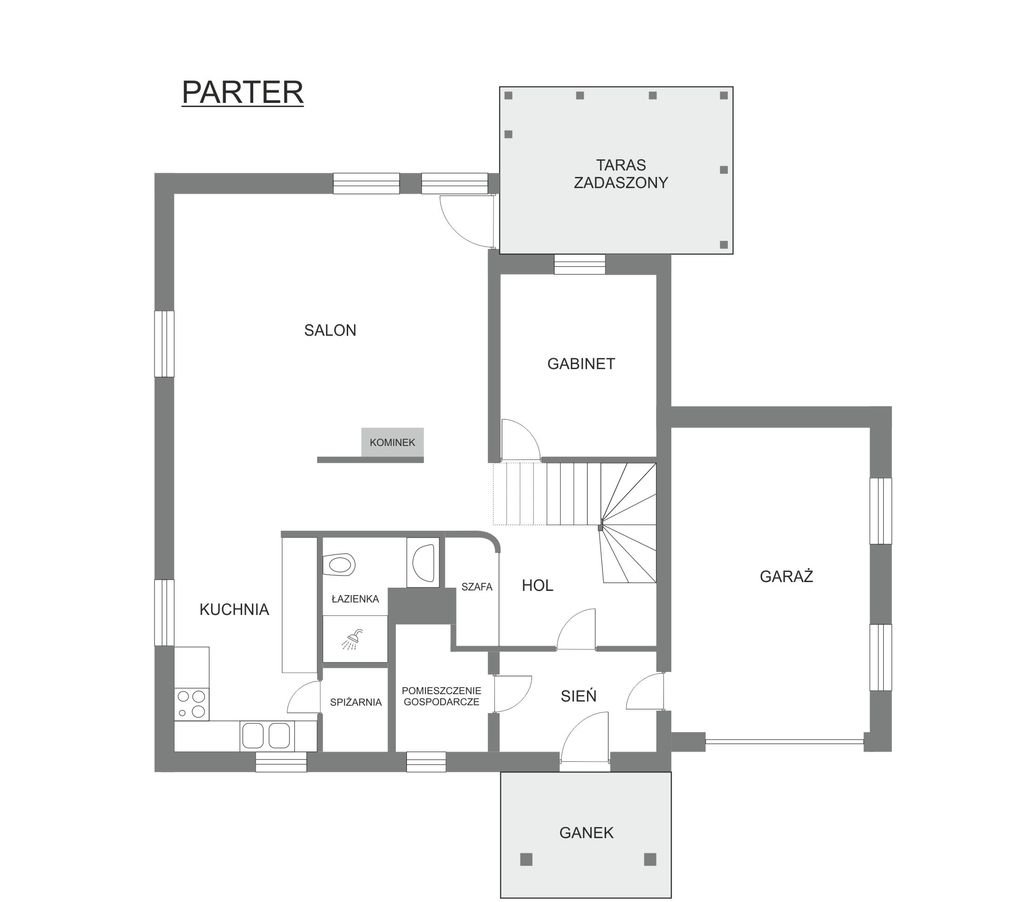 Na parterze znajduje się duży salon z kominkiem (34 m²), kuchnia (10 m²) z osobną spiżarnią, gabinet (9 m²), łazienka (3,5 m²), hol z zabudowaną szafą oraz schody na piętro. Z sieni (wiatrołapu) bezpośrednie przejście do pomieszczenia gospodarczego (3,8 m²; kocioł c.o. i c.w.u.) oraz ogrzewanego garażu (20 m²). Z salonu wyjście na drewniany, duży, zadaszony taras (18 m²) z widokiem na ogród.