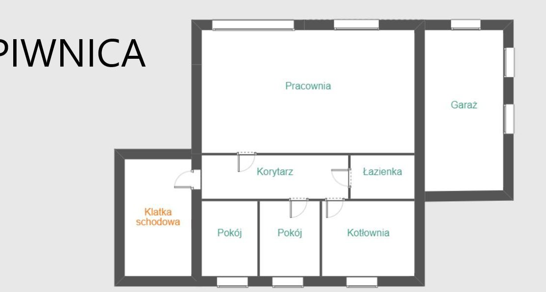 - składa się z kotłowni, dwóch pomieszczeń gospodarczych, łazienki, garażu z kanałem oraz pomieszczenia które kiedyś służyły jako warsztat stolarski. Wszystkie pomieszczenia posiadają okna. Cała kondygnacja może być zagospodarowane na działalność gospodarczą np. pracownie, biuro lub pełnić funkcję mieszkalną,