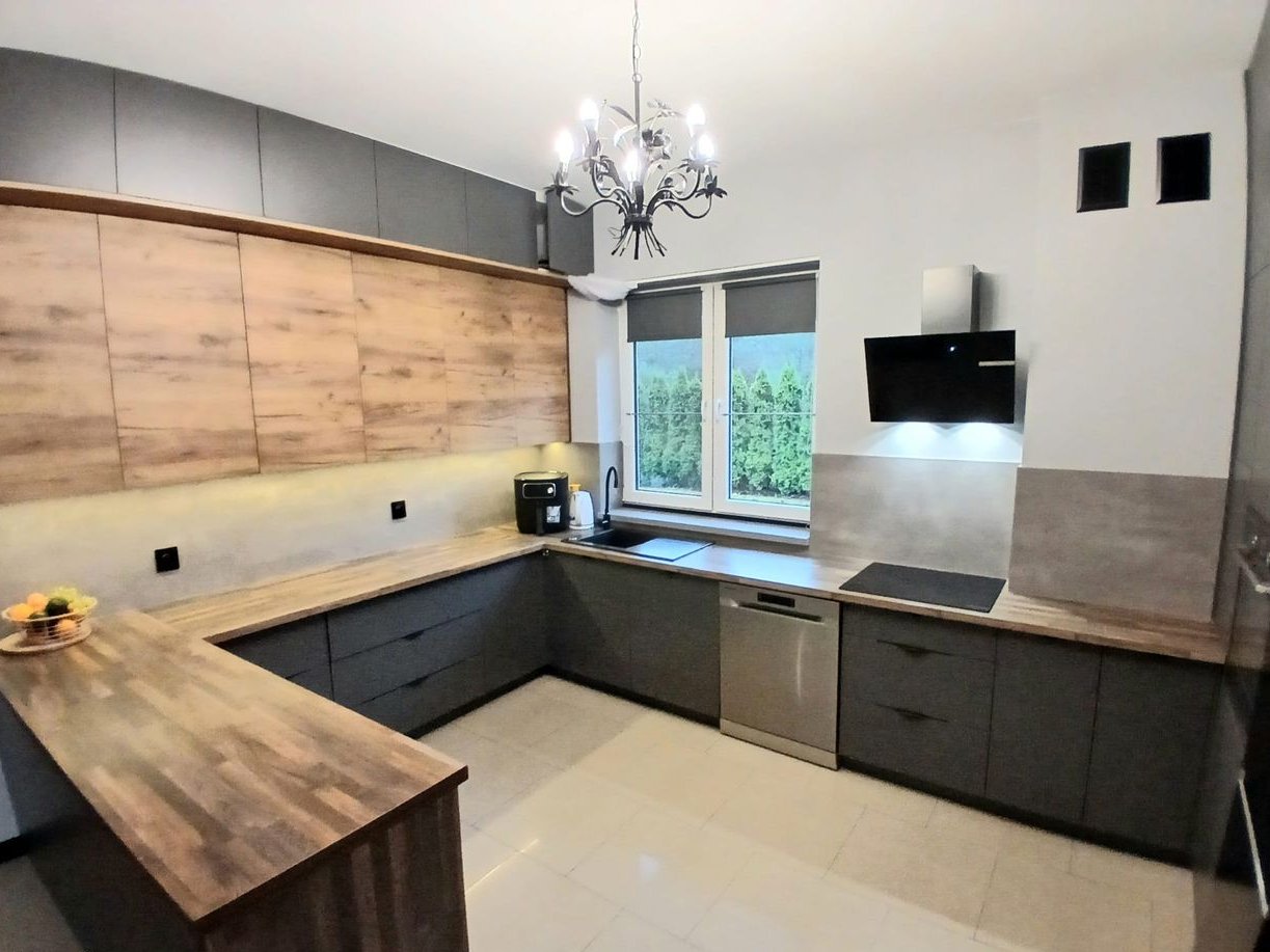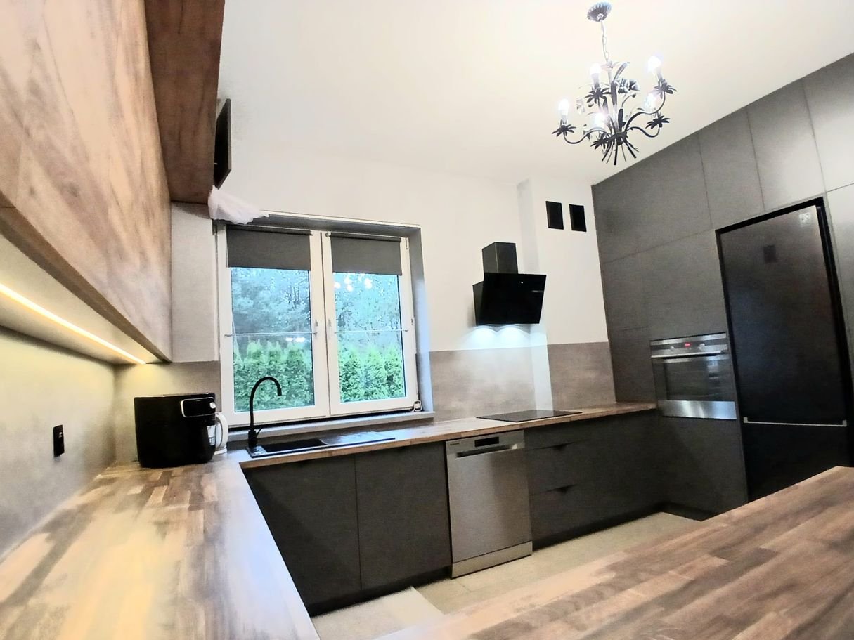 Kuchnia jest nowa, z nowymi frontami oraz dodatkowymi meblami, wykonana z wysokiej jakości materiałów.