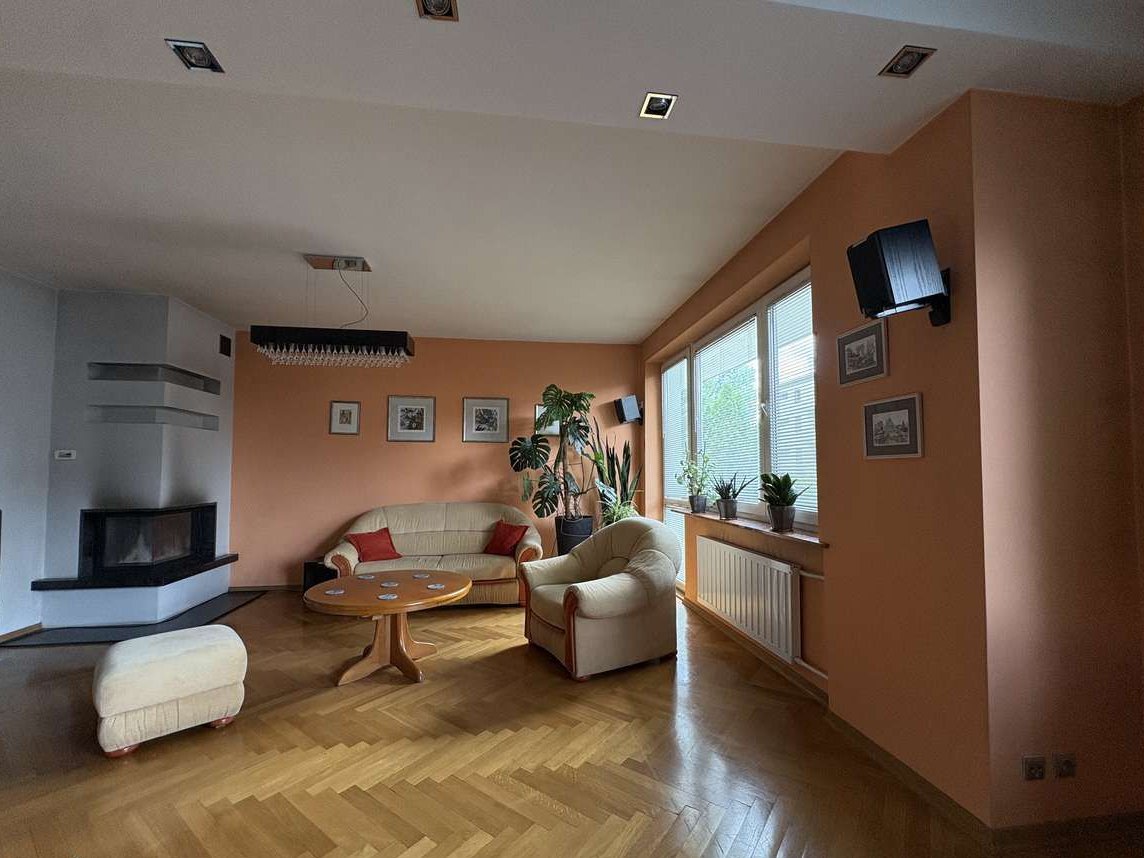 przestronny salon z kominkiem