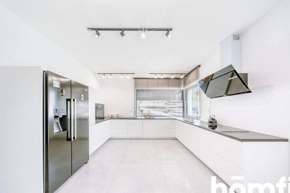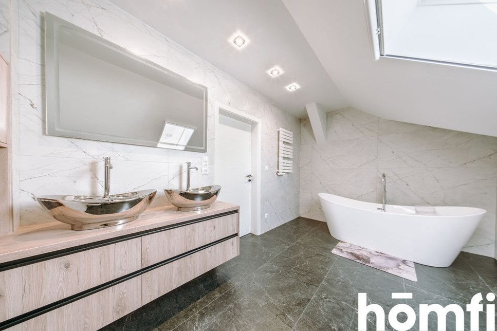 The living area of approximately 170 m² consists of three bedrooms, a kitchen combined with a dining room and living room, a bathroom, a utility room and a pantry. There is a fireplace in the living room, which adds coziness to the interior, and from the dining room and living room there is an exit to the illuminated terrace through HST sliding doors. All floors, stairs, window sills, terrace and furniture are made of exotic Merbau wood, which emphasizes the exclusivity of the interior. The apartment is fully furnished and equipped with household appliances, air conditioning, a modern heating system, monitoring, smart home system. The living area of the ground floor is approx. 120 m2 and over 3m high (plus 70 m² of utility rooms). There is underfloor heating on the entire surface of the property, which has very low gas consumption in the winter. Additionally, the building has an alarm system connected to a security agency and internal and external monitoring. All windows in the building additionally contain electric roller shutters.