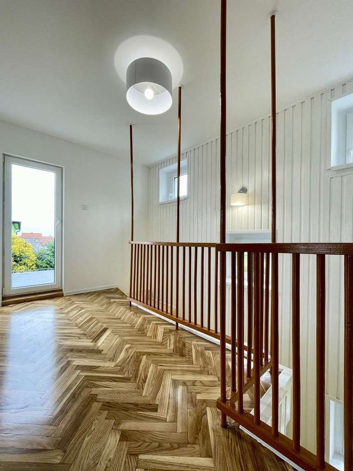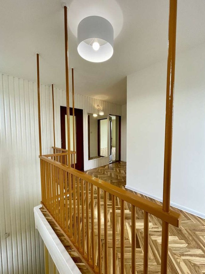 Dom po remoncie. Nowa elewacja, nowe okna i parapety, nowe drzwi wejściowe i garażowe, odnowione balustrady i balkony. W środku odmalowany, nowe sufity w części domu, oświetlenie, podłogi drewniane (dębowe i bukowe) po renowacji, nowa łazienka na II p.