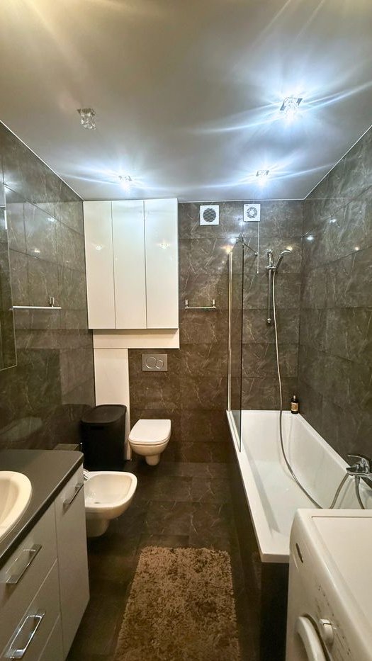 Elegancka łazienka: wanna z prysznicem, bidet, WC, pralka, szafka z umywalką, płytki w kolorze szarego marmuru