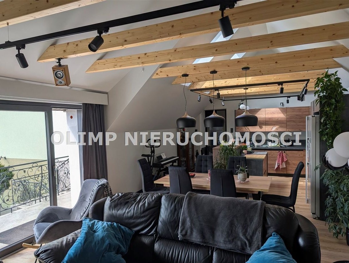 Na 1 piętrze salon z otwartą kuchnią i wyjściem na taras, dwie sypialnie i stara kuchnia. Powierzchnia łącznie 110,65 m2.
