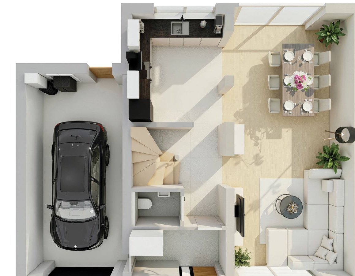 - na parterze znajduję się widna kuchnia, przestronny salon połączony z jadalnią, toaleta, przedpokój, wiatrołap oraz garaż.