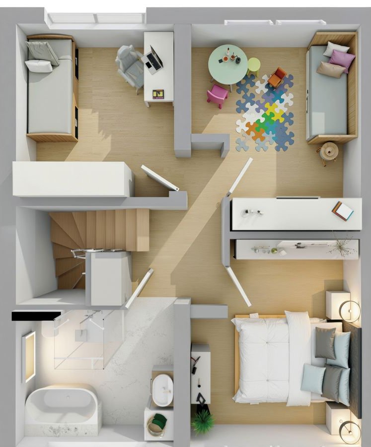 - na pierwszym piętrze mieszczą się 3 sypialnie, łazienka kąpielowa, przedpokój.