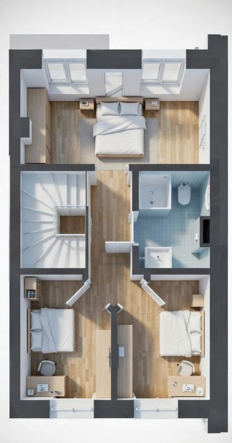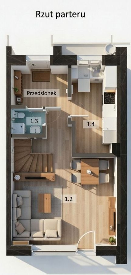 Układ przestrzeni został zaplanowany tak, aby część dzienna i nocna były wyraźnie rozdzielone, co podnosi komfort codziennego użytkowania.