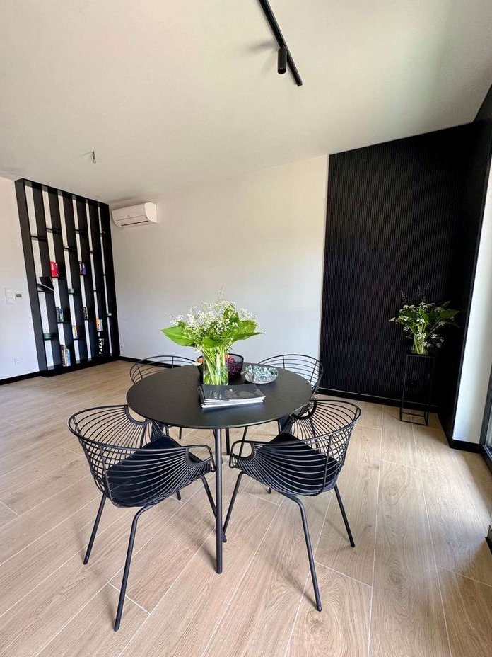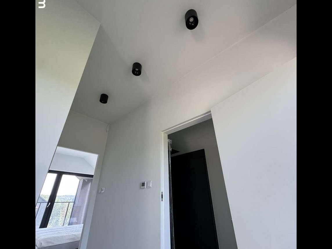 Wykończenie w wysokim standardzie: naturalne materiały, jasne wnętrza, duże przeszklenia, taras z widokiem na zieleń