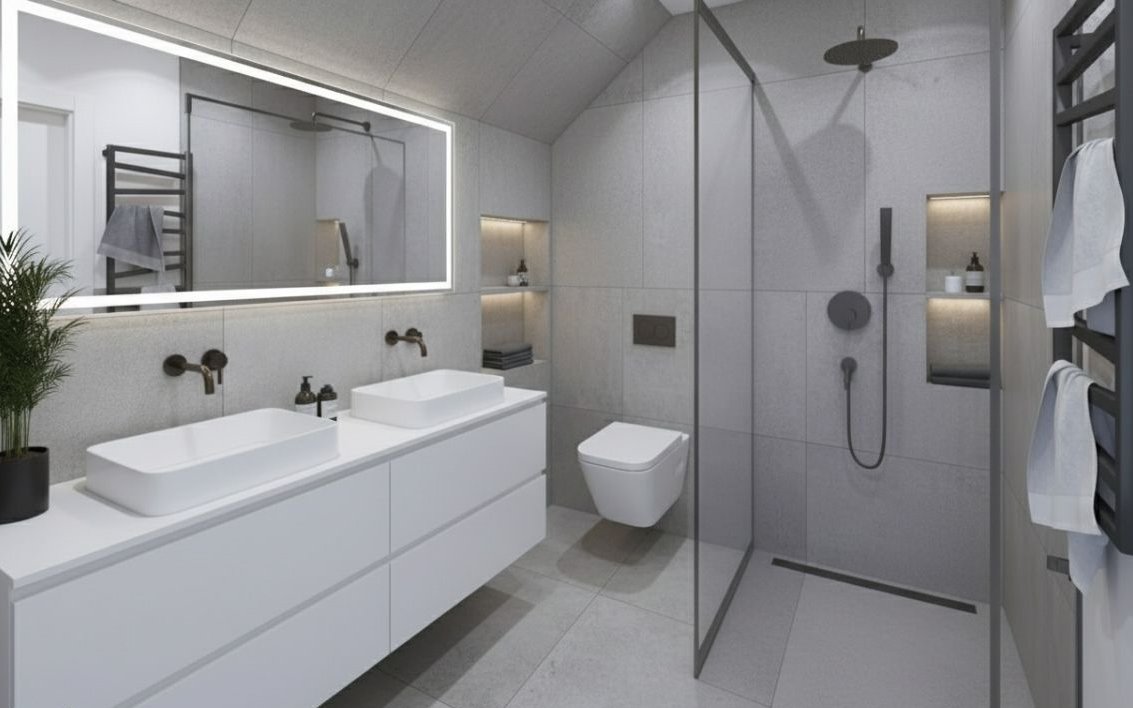 Ogrzewanie: pompa ciepła (ogrzewanie podłogowe + instalacje pod montaż grzejników drabinkowych w łazienkach)