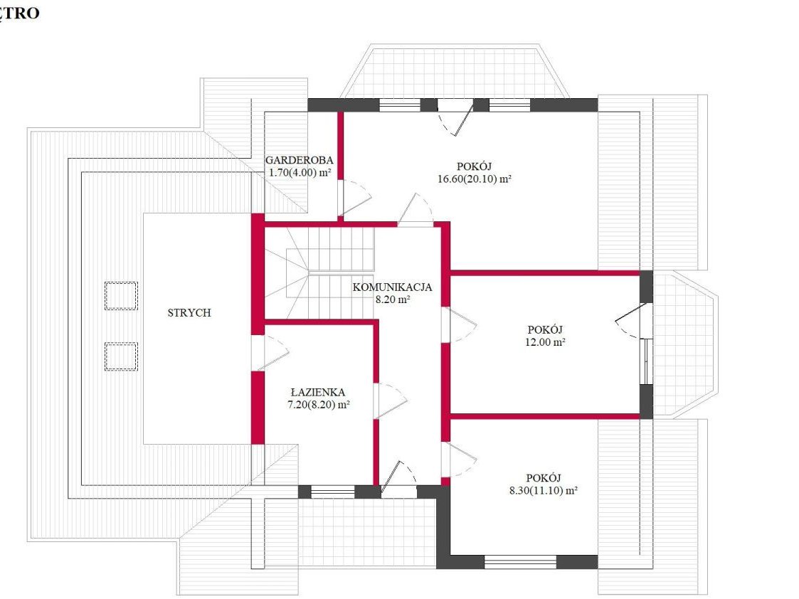 Na piętrze znajduje się strefa prywatna domowników obejmująca trzy sypialnie, garderobę oraz łazienkę. Dzięki takiemu podziałowi dom zapewnia zarówno wygodną przestrzeń wspólną, jak i prywatność dla mieszkańców.