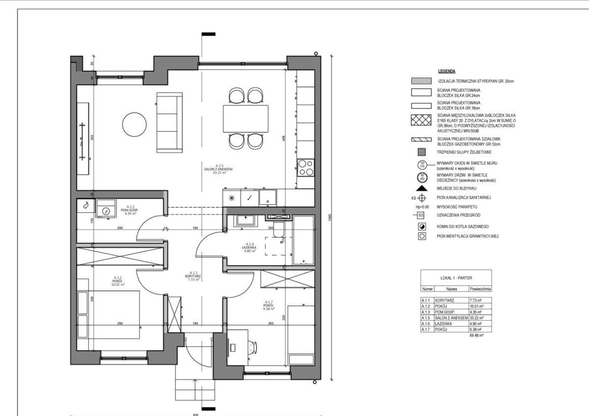 - w części parteru będzie wiatrołap , salon z aneksem kuchennym, trzy pokoje sypialniane, pomieszczenie gospodarcze
