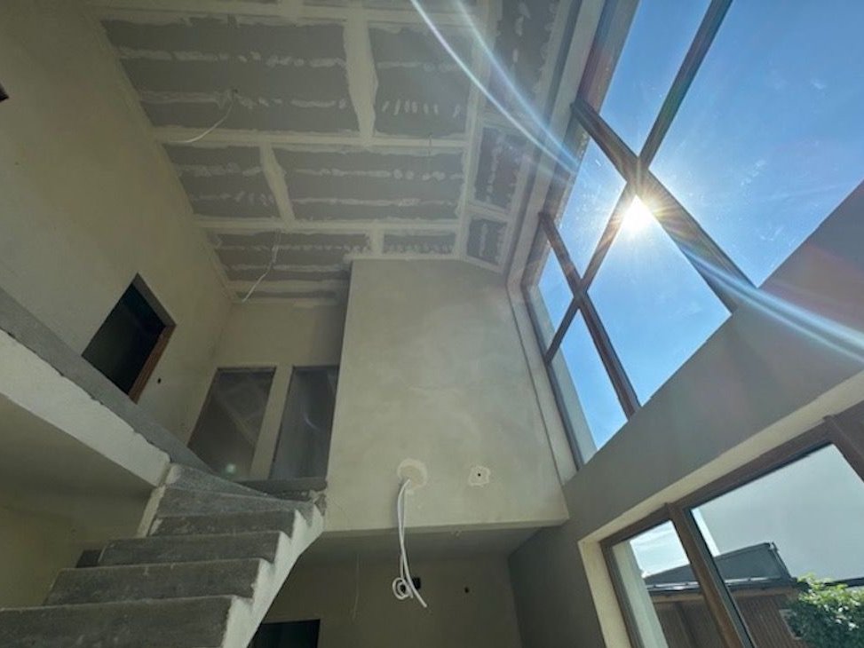 Wnętrze zostało zaplanowane tak, aby zapewnić wygodę dużej rodziny oraz komfort pracy zdalnej. Dom oferuje trzy łazienki i ponadstandardową wysokość pomieszczeń (parter 2,80 m, piętro 3,40 m).