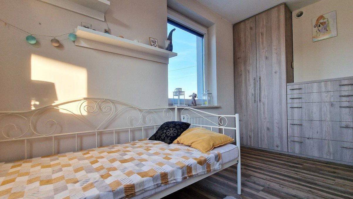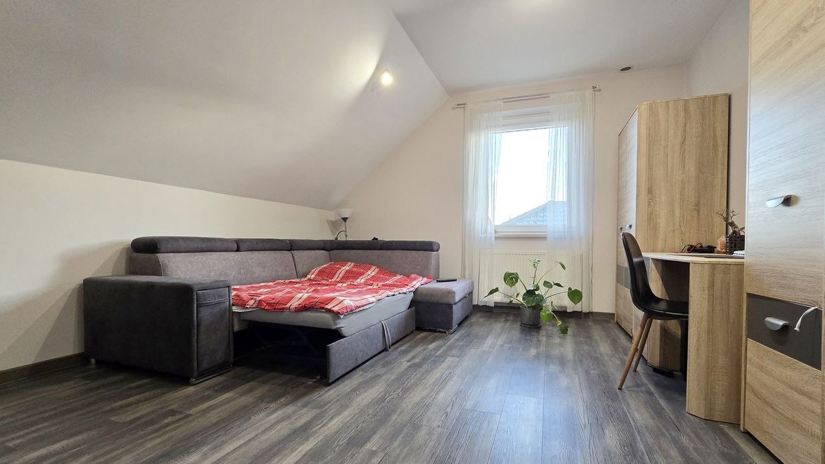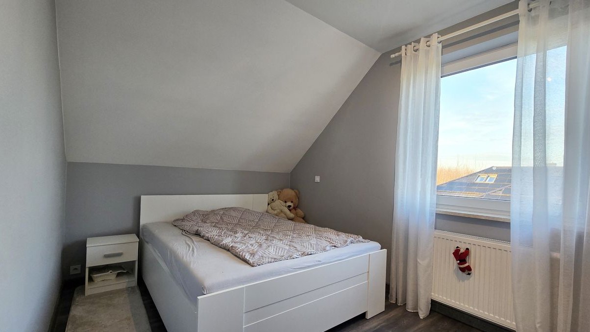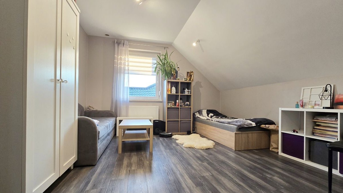 Poddasze użytkowe obejmuje trzy ustawne sypialnie, hol oraz łazienkę z WC i wydzieloną częścią pralni, w której znajduje się dodatkowo prysznic. Dodatkowym atutem jest wykonany strych, idealny do przechowywania rzeczy sezonowych.