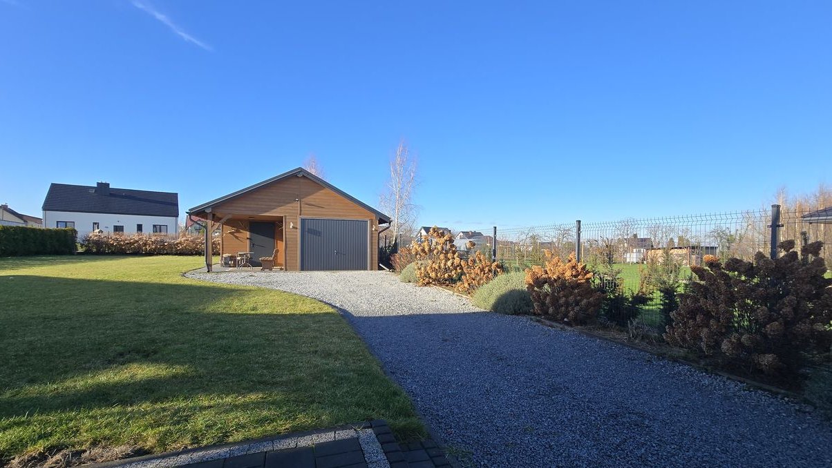 Ogród obsadzony jest nasadzeniami z lat 2020–2021 – tuje zapewniają prywatność, hortensje dodają elegancji, a lawenda wprowadza naturalny klimat. W tylnej części działki znajduje się wolnostojący garaż jednostanowiskowy z dodatkowym miejscem do przechowywania oraz przylegający budynek gospodarczy, oba zasilone energią elektryczną. Wejście na teren działki umożliwia druga furtka, a sama działka posiada dostęp do drogi z dwóch stron, co zwiększa jej funkcjonalność oraz możliwości zagospodarowania.