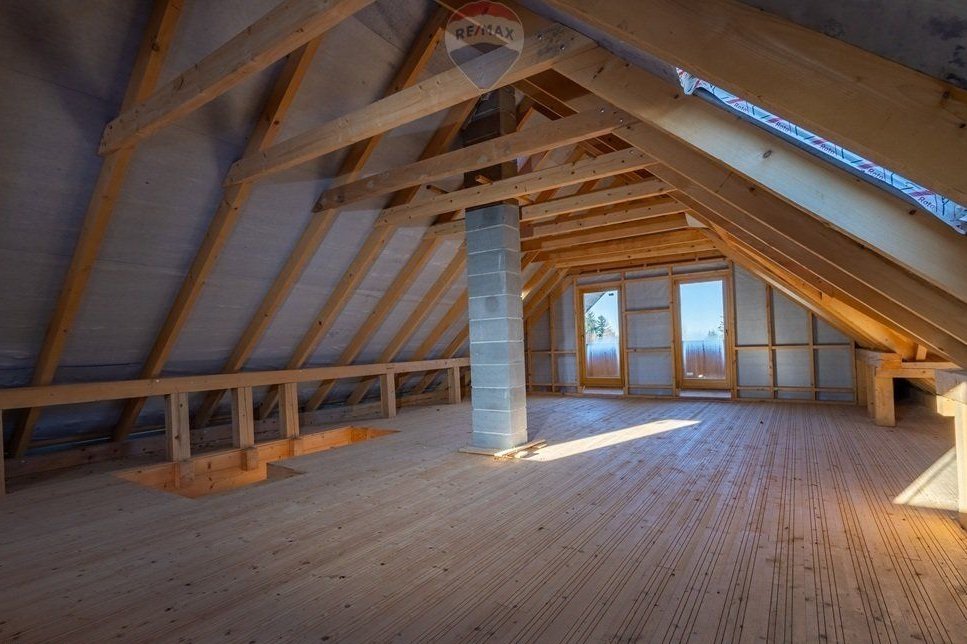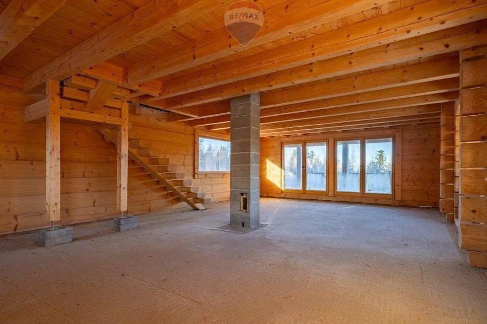 * Stan: Surowy zamknięty "+" - obejmuje: Dach pokryty blachodachówką, ściany z pół bala drewnianego (35-38 cm), uszczelnione i wyszlifowane; ocieplona i izolowana płyta fundamentowa, schody wewnętrzne z litego drewna, okna drewniane, parapety zewnętrzne, drzwi wejściowe antywłamaniowe, kanały techniczne pod instalacje elektryczną, poddasze przygotowane do ocieplenia, media: woda, szambo, prąd, internet.